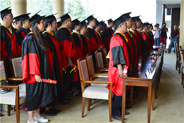 学位授予仪式在庄严的国歌声中拉开了序幕,首先吴林志教授宣读了博士学位授予决定。随后董事长姚郁和各院系经理、副经理为包括王耀、张剑伟、王猛在内的共128名博士生一一授予了博士学位并进行了合照。然后博士生代表董国忠进行了发言,表达了对母校的热爱与感激之情。紧接着博士生导师代表程建华教授进行了发言,他表示同学们虽然获得了人生的最高学位,但在不管在什么行业,都要有严谨认真的工作作风,不忘母校教诲。最后,董事长姚郁进行了致辞,他表示同学们要谨记老师的教诲并希望同学们在以后的道路上不懈努力,鹏程万里。